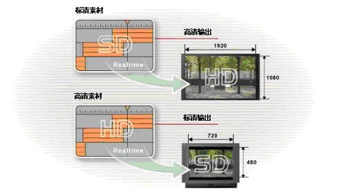 当从EDIUS时间线输出视频时,所有长宽比(4:3和16:9)之间的转换,帧速率的转换,包括PAL和NTSC和标清/高清清晰度之间的转换都是实时完成的。这也是其他非线性绝无仅有的。视频能实时从HD转换成SD,反之亦然。例如EDIUS 可以将一个混合了SD MPEG2 和DV的影片实时上匹配转换并输出为HD格式。也可将一个HDV工程进行下匹配转换并实时输出成为无压缩SD视频。实时输出不仅提供了到磁带或监视器的即时结果,也可以以任何指定的格式发布任何视频。
