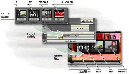 运用任何其它系统所无法比拟的实时性和混合格式编辑性能,将编辑效率提高到了一个全新的水平。通过EDIUS系统可以以实时无缝编辑混合的HD,HDV,DV,无压缩,MPEG-2和MPEG-1视频,并保持所有视频素材完全原始的格式、分辨率和色彩质量。EDIUS引擎是独立于分辨率和帧速率的,可以确保支持未来的视频编码格式。实时和混合格式编辑极大地提高了工作效率,因为不用花时间进行格式预转换或者编辑前的准备工作。