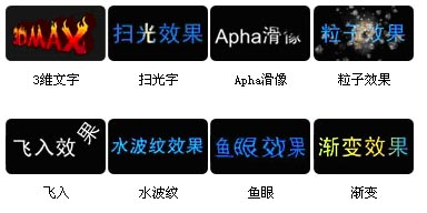 跳动球,广告牌,碎片,卷筒,旋转立方体,双开门,飞出,卷页,扭曲,波纹,缩放,溶解,云彩,烟雾,水波纹,爆炸盒,蝴蝶,照相机,卡片,传送波,水波纹,方格,圆形,卷帘,钻石,圆环,心型,擦除,喷物,飞溅,螺旋,混合,旋转立方体,3D溶入溶出,翻转,倒影,四向卷页,卷页飞出,球体,双向卷页……